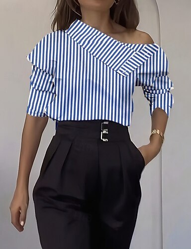 Mulheres Saia Blusa Túnica Tira de Prender Assimétrico Listrado Elegante à moda Negócio Manga Longa Decote V Colarinho Chinês Tops regulares Diário Trabalho Branco e Azul Verão Primavera Outono