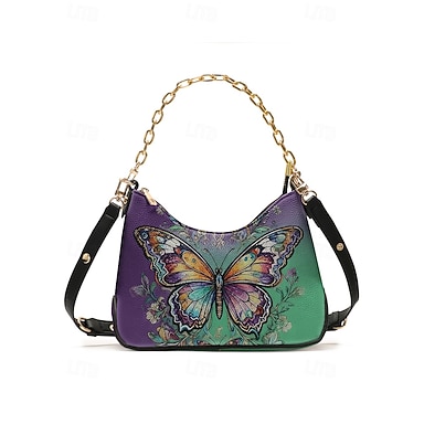 Bolsa de ombro feminina em couro sintético com alça ajustável, estampa de borboletas, diversas opções de cores, versátil para usar em ocasiões casuais e formais.