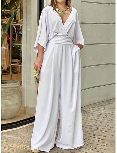 Mulheres Normal Macacão Elegante Côr Sólida Manga 3/4 Perna larga Decote V Bolsos Diário Férias Ajuste Largo Azul Preto Branco Verão