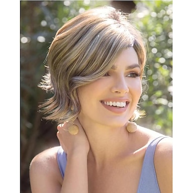 peruca bob em camadas douradas claras com franja de cortina para mulheres peruca bob com mechas sintéticas corte pixie curto peruca ondulada em camadas para mulheres