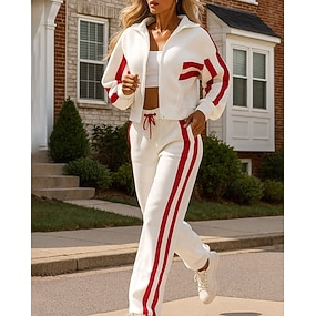 Natal Mulheres Moletom com zíper Agasalho de 2 peças Conjuntos de moletom Folgado com bolso Riscas Conjuntos Outono Preto Branco Elastano Equitação Vocação Exterior Manga Longa Esporte Roupas