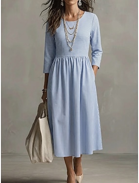 Mulheres Vestido midi Vestido casual Vestido De Algodão Vestido A Line Moda Moderno Diário Ao ar livre Férias Normal Listrado Manga 3/4 Gola Redonda Azul Claro Verão Primavera
