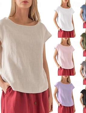 Mulheres Camiseta Linho de algodão sintético T-shirt Côr Sólida Gráfico Tecido Moda Clássico Casual Manga Curta Gola Redonda Decote Redondo Tops regulares Diário Para Noite Final de semana Azul