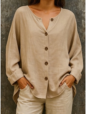 Blusa Feminina 100% Algodão Camisa de Linho Falso Botões Cor Sólida Diária Estilosa Básica Manga Longa Decote em V Tops Regulares Diários Branca Verão Primavera Outono