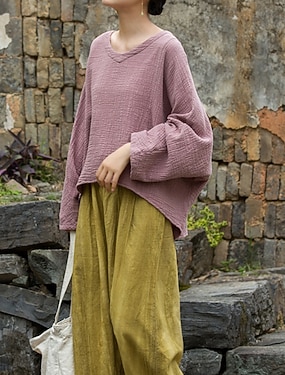Mulheres Camisas de algodão e linho Blusa Barra Assimétrica Tecido Vintage à moda Manga Longa Decote V Tops regulares Diário Para Noite Amarelo Roxo Bege Outono Inverno