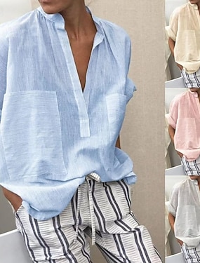 Mulheres Camisa Social Blusa Linho de algodão sintético Listrado Vintage à moda Moderno Manga Curta Decote V Tops regulares Diário Feriado Para Noite Amarelo Rosa Azul Céu Cinza Claro Verão Primavera