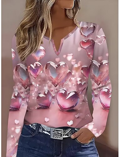 Mulheres Camiseta Imprimir Coração Gráfico Vintage à moda Clássico Manga Longa Decote V Pescoço Entalhado Tops regulares Diário Azul Rosa Roxo Verão Primavera Outono