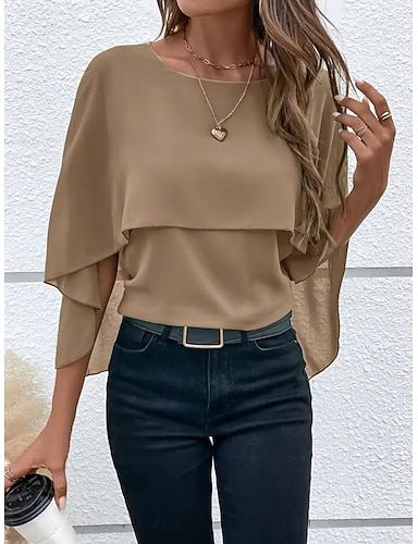 Mulheres Tops de chiffon Renda Multi Camadas Elegante Manga 3/4 Sino Gola Redonda Tops regulares Diário Convidado do casamento Oliva Primavera / Outono / Inverno / Verão