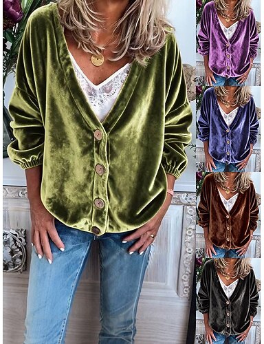 Mulheres Blusa Botões Côr Sólida Férias à moda Casual Manga Longa Decote V Tops regulares Diário Azul Preto Roxo Marron Verde Primavera Outono Inverno