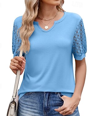 Mulheres Camiseta T-shirt Renda Patchwork Tecido Moda à moda Clássico Manga Curta Decote V Tops regulares Diário Para Noite Final de semana Azul Branco Amarelo Vermelho Verde Verão Primavera