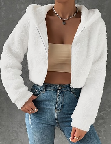 Mulheres Casaco de inverno Jaqueta sherpa Casaco de pelúcia Manter Quente Zip Completo Moda Casual Tecido Férias Rua Roupa Diária Para Noite Zíper Curto Com Capuz Normal Manga Longa agasalhos Branco