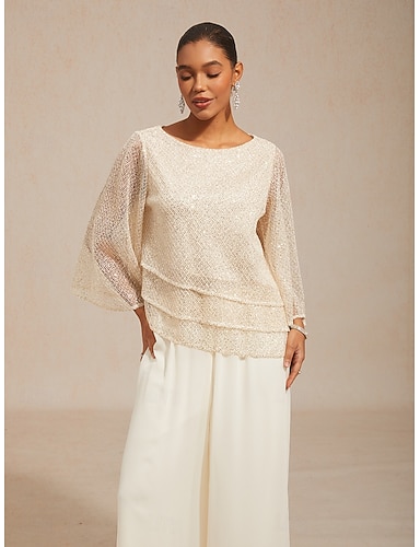 Mulheres Camisa Social Malha Íntima Conjunto de gêmeos Cordões Paetês Com Transparência Elegante Manga 3/4 Gola Redonda Convidado do casamento Traje para coquetel Champanhe Verão Primavera Outono