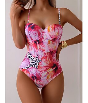 Maiô Feminino de uma Peça Redutor Boho Monokini Controle de Barriga Cintura Alta Slim Costas Nuas Moda de Férias Praia Gráfico Floral Decote U Sem Mangas