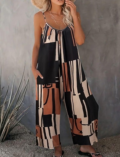Womens Dungarees 100% Algodão Ativo Floral Sem Mangas Reto Decote Quadrado Com Bolso Férias Diário Ajuste Solto Laranja Verde Bege Verão
