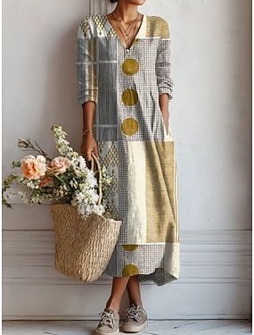 Vestido Midi Feminino Linho Como Respirável Leve Vestido de Verão Vestido Shift Casual Festa Férias Corte Solto Geométrico Manga Longa Decote em V Amarelo Rosa Marrom Claro Verão Primavera