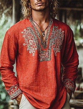 Homens Camisa Popover camisa de verão Roupa de Praia camisa vintage Camisa étnica Floral Férias Feriado Amarelo Azul Laranja Marron Manga Longa Decote V Verão Primavera Roupa