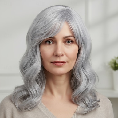 Peruca cinza prateada feminina, cabelo ondulado na altura dos ombros com franja lateral, peruca sintética resistente ao calor com aparência natural para uso diário e festas.