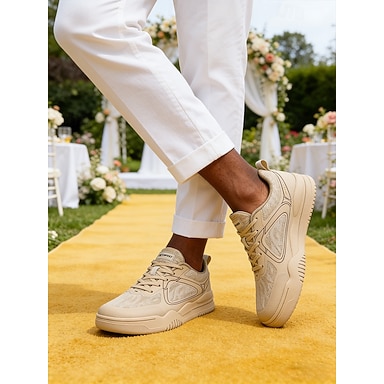 Tênis casual masculino bege para casamento – calçado leve, respirável e confortável para casamentos ao ar livre, recepções e uso no verão.