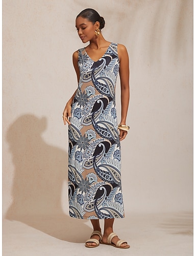 Vestido longo de malha elástica com estampa paisley vintage para férias