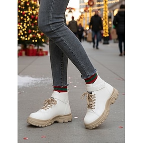 Botas brancas femininas de cano curto com cadarço – botas de inverno com sola grossa, estilosas para o Natal, looks urbanos e passeios casuais.