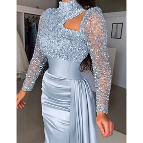 Vestido de Noite Sereia Lantejoula Vestido Elegante Formal Cauda  Penteado Manga Longa Decote Alto Cetim com Pérolas Vestido de Máscara