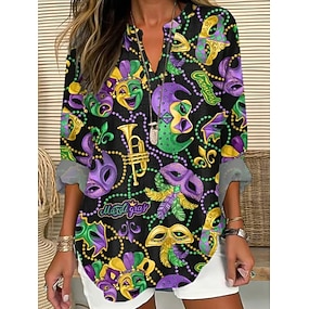 Blusa Feminina do Mardi Gras Linho Semelhante Respirável Leve Gráfica Vintage Estilosa Diária de Manga Longa V Neck Tops Regulares Estampa do Dia das Férias Amarelo Roxo Verde Verão Primavera