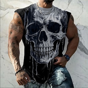 Regata masculina com estampa de caveira grande esfumaçada, estilo gótico, motociclista, rock, ousada e de terror. Ajuste perfeito para academia, fitness, streetwear, casual, verão, de grife. Tamanhos: