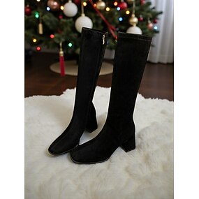 Botas femininas pretas acima do joelho – botas de inverno de camurça sintética com salto baixo para streetwear e looks casuais