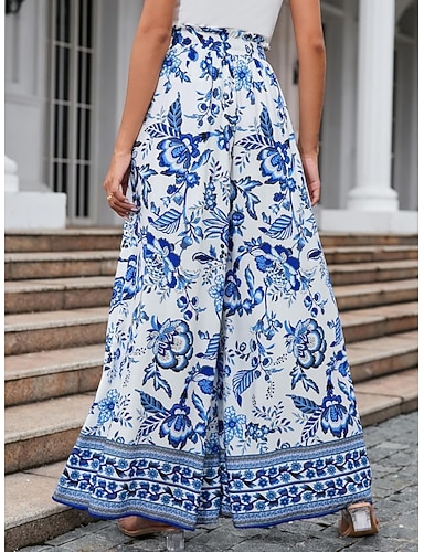 Mulheres Perna larga chinês Férias Vintage Boho Comprimento total Cintura Alta Floral Gráfico Bolsos Cintura elástica Estampado Confortável Conforto Macio Com Stretch Ao ar livre Férias Rua Azul Azul