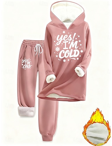 Mulheres Quente Moletom Sherpa Calças de lã Conjunto de moletons calças Manga Longa Gola Redonda Côr Sólida Letra Ao ar livre Preto Vermelho Castanho Claro Primavera Superdimensionado