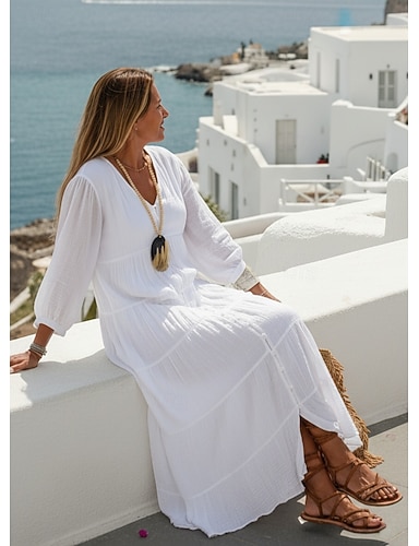 Mulheres Vestido maxi longo Vestido Longo Linho de algodão sintético Camisetão Vestidos Para o Verão Vestido Kaftan Férias Básico Moderno Diário Final de semana Ajuste Largo Tecido Manga 3/4 Decote V