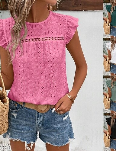 Mulheres Camisetas com bordado de olho Frufru Com Corte Tira de Prender Côr Sólida Elegante Vintage à moda Manga Curta Concha Gola Redonda Decote Redondo Tops regulares Casual Diário Para Noite