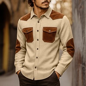 Homens Camisa Social Camisa casual camisa de botão Camisa de carga Camisa malha waffle Preto Caqui Manga Longa Bloco de cor Textura Lapela Ao ar livre Casual Patchwork Roupa Moda Casual Vintage retrô