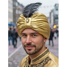 Chapéu Metálico Dourado de Poliéster Masculino de Mardi Gras com Plumagem e Broche - Acessório de Fantasia de Príncipe Sultão ou Árabe para Carnaval e Máscaras