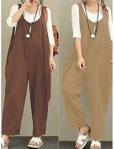 Mulheres Normal Calças de algodão e linho Roupa de rua Côr Sólida Sem Manga Decote U Bolsos Rua Diário Normal Preto Azul Marinha Cáqui Verão