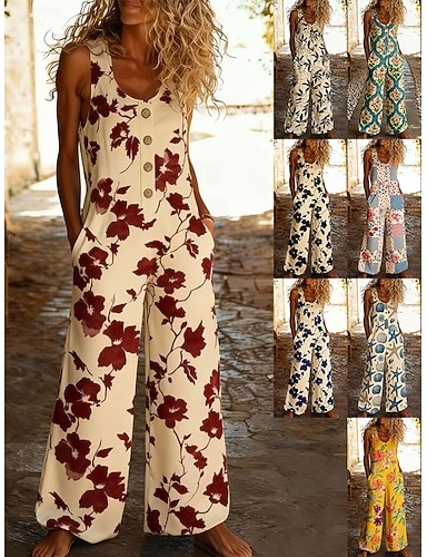 Macacão feminino casual em linho sintético com estampa floral, sem mangas, pernas largas, decote em U e bolsos, ideal para uso diário, férias e verão. Disponível nas cores azul, preto e amarelo.