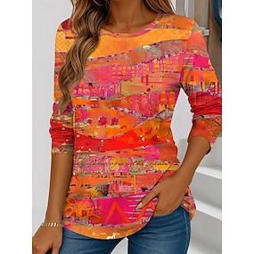 Camiseta feminina manga longa decote redondo tunica gráfica geométrica abstrata elegante vintage estilo camiseta regular impressão diária rosa azul roxo verde