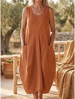 Vestido Feminino 100% Algodão Maxi Vestido de Linho Falso Vestido Casual Diário Solto Liso Manga 3/4 Decote Redondo Preto Laranja Verde Bege Verão Primavera Outono