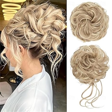 2 peças de aplique de cabelo para coque bagunçado, grande, ondulado e cacheado, com elástico, scrunchies, coque rosquinha volumoso e grosso, apliques para penteado preso, extensões, loiro acinzentado