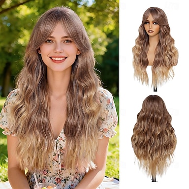 Peruca longa e ondulada loiro mel com franja cortina para mulheres, 66 cm (26 polegadas), ombré castanho a loiro, sintética, resistente ao calor, cabelo ondulado com aparência natural, para uso