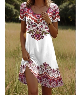 Mulheres Minivestido Vestidos Para o Verão Vestido T shirt Férias Casual Boho Para Noite Normal Gráfico Estampado Cashemere Manga Curta Decote V Azul Amarelo Vermelho Roxo Verão