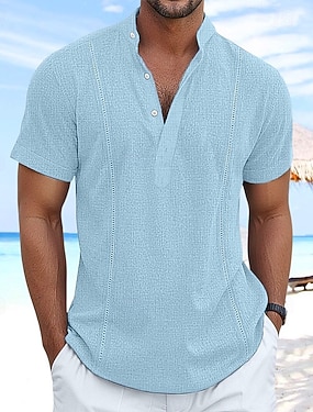 45% Linho Homens camisa de linho Camisa Popover camisa de verão camisa de praia Branco Rosa Bege Manga Curta Tecido Lapela Verão Ao ar livre Diário Roupa