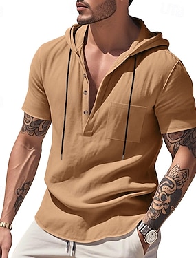 Homens Camisa Social Camisa de linho Camisa Popover Camisa casual Camisa de algodão Tecido Férias Rua Preto Branco Azul Marinha Marron Manga Curta Com Capuz Verão Roupa Cordões