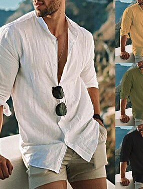 Homens Camisa Social Camisa de linho camisa de verão Roupa de Praia Camisa de colarinho de banda camisa de botão Tecido Férias Casual Preto Branco Amarelo Azul Manga Curta Colarinho Verão Roupa