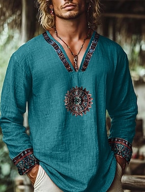 Homens Camisa Social Camisa de linho Camisa Popover camisa de verão Roupa de Praia camisas retrô Étnico Férias Rua Verde Manga Longa Decote V Verão Primavera Roupa