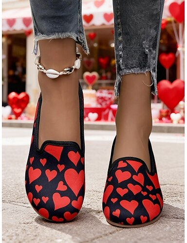 Sapatos femininos pretos sem cadarço com estampa de coração vermelho – sapatos casuais com estampa romântica e charmosa para o Dia dos Namorados, encontros e uso diário.