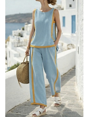 Conjuntos femininos de duas peças em linho sintético com toque de algodão, ideais para ocasiões casuais e confortáveis, perfeitos para usar em casa, no dia a dia ou nas férias, no verão e na primavera.