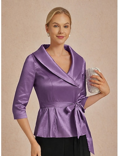 Mulheres Blusa Tops de noite gravata na frente Côr Sólida Tecido Elegante Metálico à moda Manga 3/4 Decote V Tops longos Festa de Noite Convidado do casamento Semi formal Lilás Verão Primavera Outono