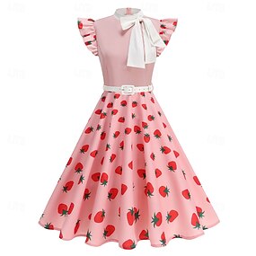Elegante Vintage Anos 50 Meio-dia Vestidos Mangas curtas Bordado Morango Linha A Justo & Evasê Decote V Fantasia Mulheres Dia dos namorados Casual Festa de Noite Festa de Chá Adulto Vestido Primavera