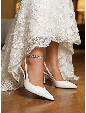 Sapatos de noiva brancos de bico fino e salto alto - elegantes sapatos de salto para casamentos no jardim.